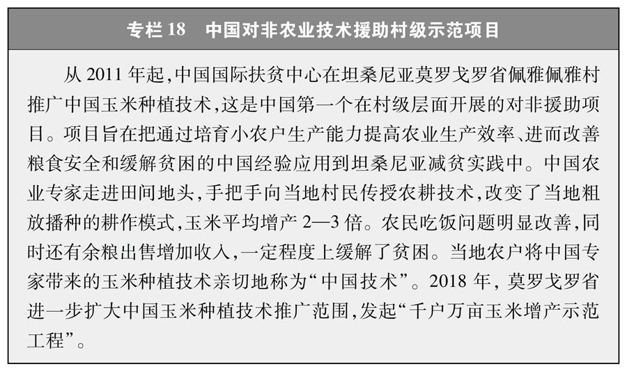 實(shí)施惠及民生的國際減貧合作項(xiàng)目。在亞洲地區(qū),中國與東盟國家共同開展鄉(xiāng)村減貧推進(jìn)計(jì)劃,在老撾、柬埔寨、緬甸三國鄉(xiāng)村基層社區(qū)實(shí)施“東亞減貧示范合作技術(shù)援助項(xiàng)目”(專欄17)。在非洲地區(qū),中國為非洲國家援建水利基礎(chǔ)設(shè)施、職業(yè)技術(shù)學(xué)校、社會(huì)保障住房等設(shè)施,打造農(nóng)業(yè)合作示范區(qū),推進(jìn)實(shí)施中非菌草技術(shù)合作、中非友好醫(yī)院建設(shè)、非洲疾控中心總部建設(shè)等項(xiàng)目(專欄18)。在南太平洋地區(qū),中國推動(dòng)落實(shí)對(duì)太平洋島國無償援助、優(yōu)惠貸款等舉措,開展基礎(chǔ)設(shè)施建設(shè)和農(nóng)業(yè)、醫(yī)療等技術(shù)合作援助項(xiàng)目。在拉美地區(qū),援建農(nóng)業(yè)技術(shù)示范中心,幫助受援國當(dāng)?shù)孛癖姅[脫貧困。中國還與聯(lián)合國教科文組織合作設(shè)立國際農(nóng)村教育研究與培訓(xùn)中心等機(jī)構(gòu),面向非洲、東南亞等國家實(shí)施農(nóng)村教育轉(zhuǎn)型、教師培訓(xùn)等項(xiàng)目。