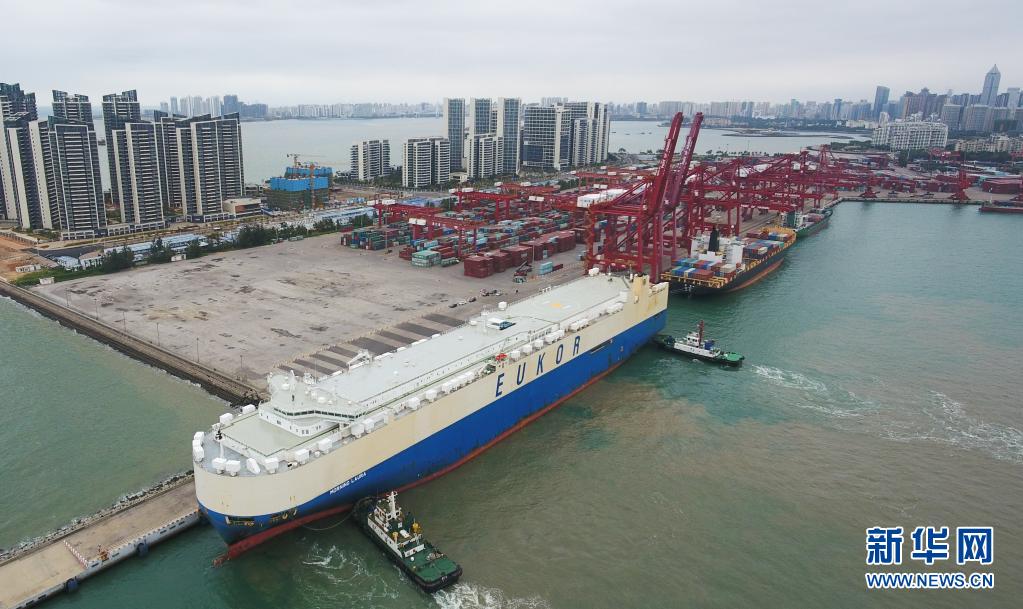 滾裝貨船“勞拉”輪駛入海口秀英港。這是海南自貿區政策實施以來的首艘汽車外貿船(2020年2月16日攝,無人機照片)。新華社記者 楊冠宇 攝