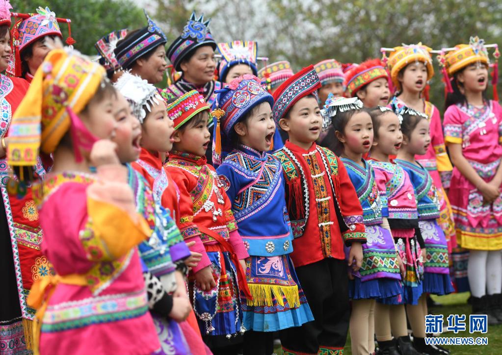 4月14日,在廣西河池市羅城仫佬族自治縣成龍湖廣場(chǎng),小朋友唱山歌歡慶“三月三”。