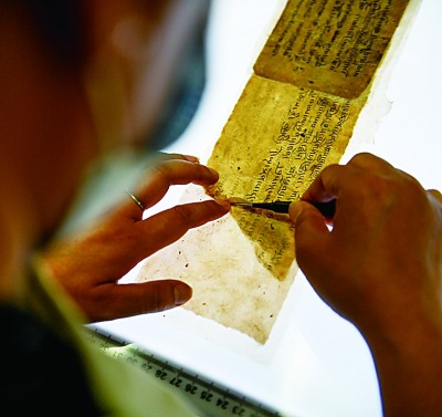 西藏古籍保護(hù)中心的工作人員修復(fù)珍貴藏文瀕危古籍文獻(xiàn)。新華社發(fā)