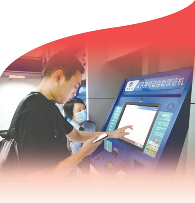 2020年10月27日,廣州公安機關工作人員在幫助市民使用居民身份證自助領證機。