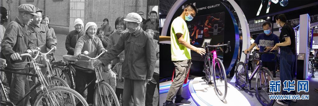 這是一張拼版照片:左圖為1982年,山東省寧津縣杜集公社李鎮(zhèn)大隊(duì)社員高高興興地買回新自行車(新華社記者李錦 攝);右圖為2021年5月8日,在海南舉行的首屆中國國際消費(fèi)品博覽會旅居生活/消費(fèi)服務(wù)展區(qū),觀眾在體驗(yàn)時(shí)尚運(yùn)動(dòng)自行車(新華社記者金立旺 攝)。
