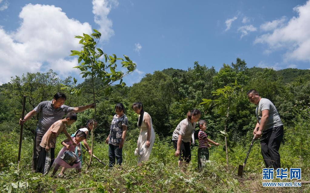 姚祖元(右一)與家人一起種樹(2019年7月13日攝)。在秦嶺深處的陜西省漢中市留壩縣火燒店鎮,姚家五代人歷時70年深耕秦嶺的故事在當地家喻戶曉,傳為佳話。新華社記者 陶明 攝