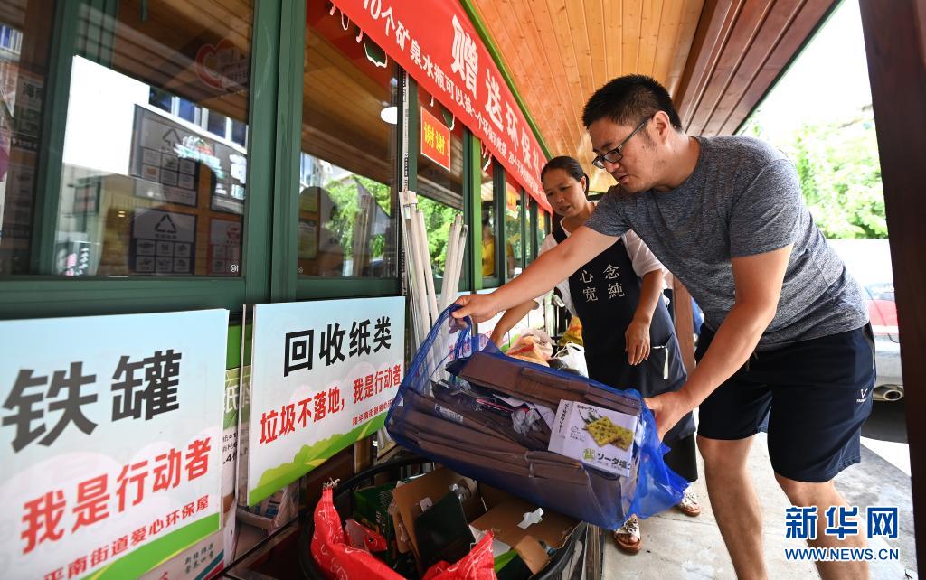 2020年8月25日,居民將生活垃圾送到海口市美蘭區和平南街道愛心環保屋,用垃圾換取紙巾、肥皂等生活用品。新華社記者郭程攝