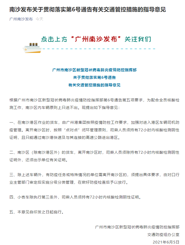 根據廣州市南沙區新型冠狀病毒肺炎疫情防控指揮部第6號通告第五項要求,為配合全員核酸檢測工作,南沙區內車輛原則上只進不出。現提出如下指導意見: