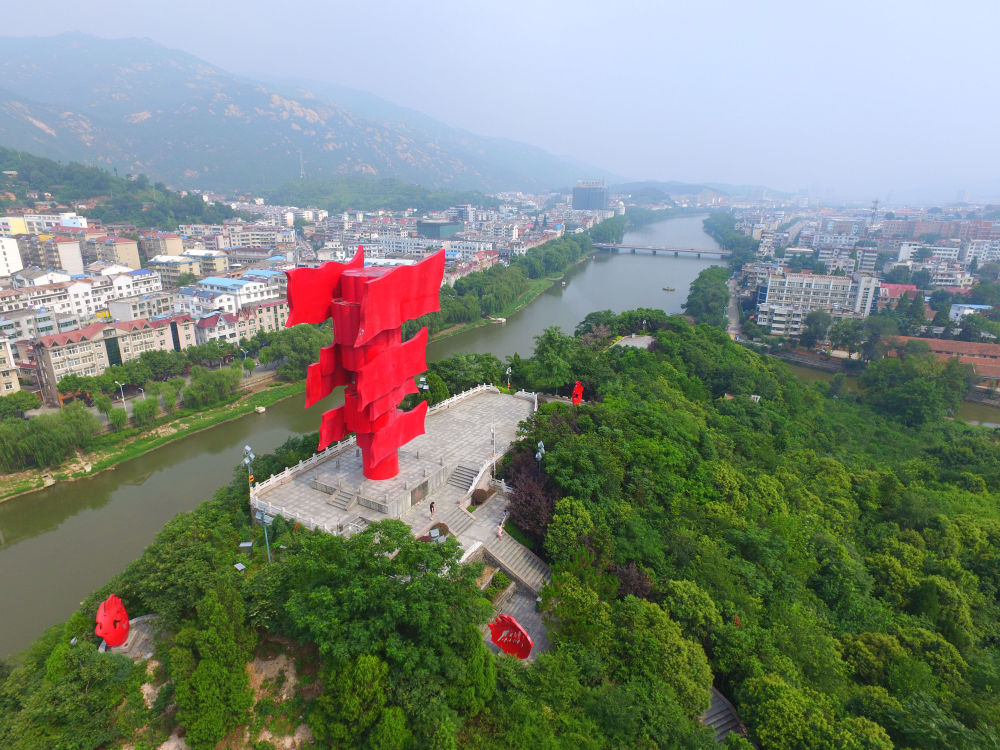 △河南省信陽市新縣鄂豫皖蘇區首府革命博物館附近的英雄山八面紅旗雕塑(2017年8月4日攝)。新華社記者 馮大鵬 攝