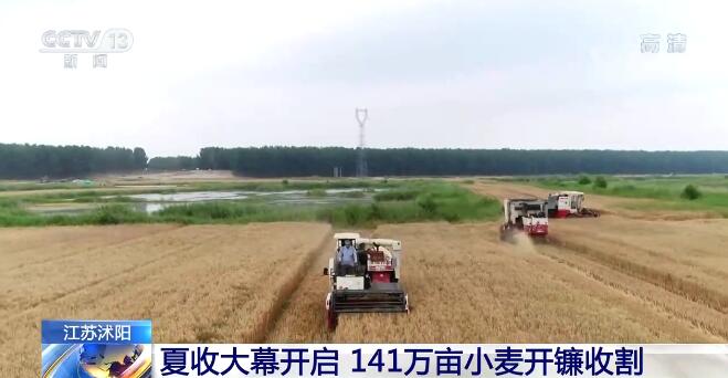 在江蘇沭陽縣,141萬畝小麥開鐮收割。伴隨著機(jī)器的轟鳴聲,收割機(jī)在金色的麥浪中來回馳騁,飽滿的麥粒歡快地蹦進(jìn)車倉。