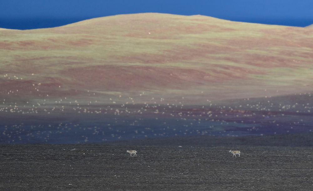 在可可西里卓乃湖區域拍攝的藏羚羊群。