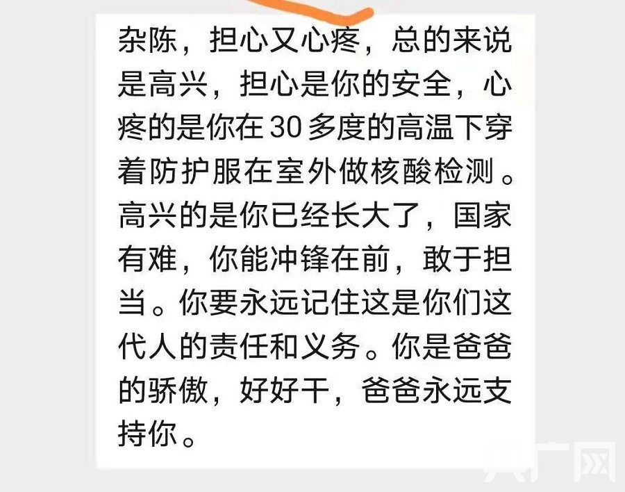 那天的核酸采樣工作直到凌晨三點(diǎn)才結(jié)束,胡洋洋回到家中已經(jīng)是凌晨四點(diǎn)多。但沒(méi)想到,一向沉默寡言的父親,不僅一直在等著自己,還留下了一段話。