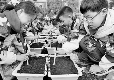江蘇省太倉(cāng)市朱棣文小學(xué)學(xué)生在種植綠色蔬菜。王建康攝/光明圖片