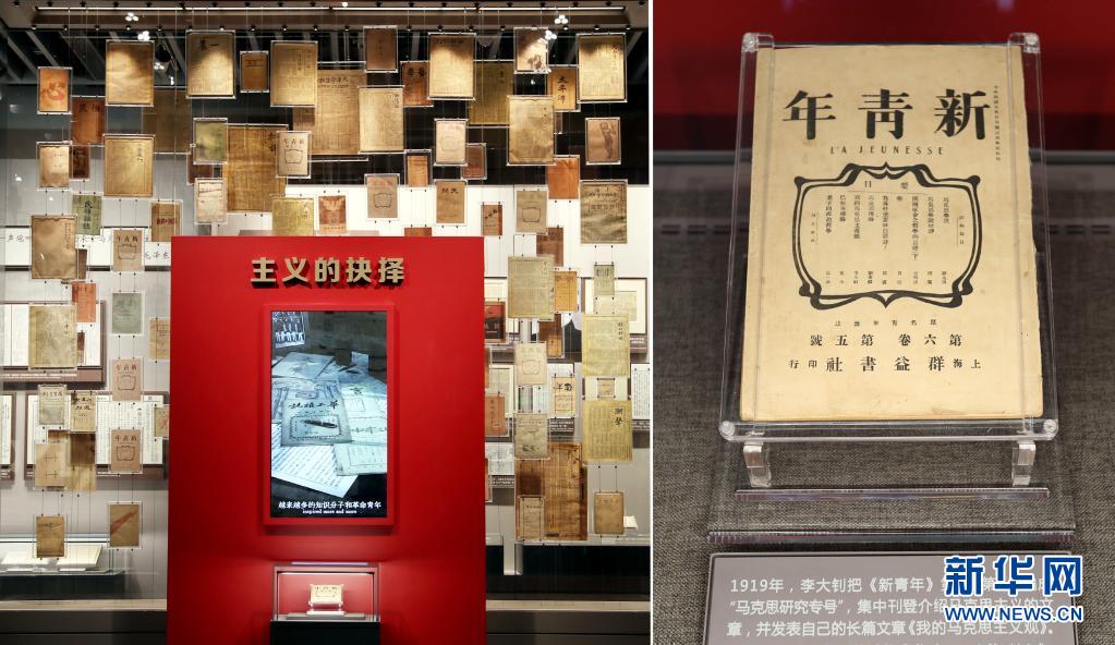 這是6月1日在上海的中共一大紀念館拍攝的大型立體式視覺置景“主義的抉擇”,100件五四運動前后傳播馬克思主義、社會主義的報紙雜志,錯落陳列在玻璃墻上。其中,《新青年》第6卷第5號“馬克思研究專號”在前端“高光”展示,這期“專號”標志著馬克思主義在中國的傳播進入了較為系統的階段。新華社記者 劉穎 攝