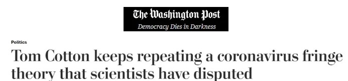 這位來自阿肯色州的參議員曾多次表示,雖然他沒有證據(jù)證明病毒起源于實(shí)驗(yàn)室,但是必須要尋找相關(guān)證據(jù),這些表態(tài)其實(shí)已經(jīng)帶有非常強(qiáng)烈的有罪推定的色彩。其他一味鼓吹叫囂實(shí)驗(yàn)室泄漏的人也從未拿出實(shí)質(zhì)性的證據(jù)。《華盛頓郵報(bào)》指出,以湯姆·科頓為代表的觀點(diǎn)就是一場(chǎng)陰謀論。