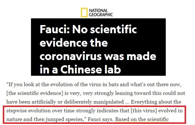 去年5月,美國(guó)國(guó)家過敏癥和傳染病研究所所長(zhǎng)福奇向《美國(guó)國(guó)家地理》雜志表示,所有關(guān)于逐級(jí)進(jìn)化的證據(jù)都強(qiáng)烈指向,新冠病毒是在自然界進(jìn)化完成,然后再跨越物種傳到人身上的。