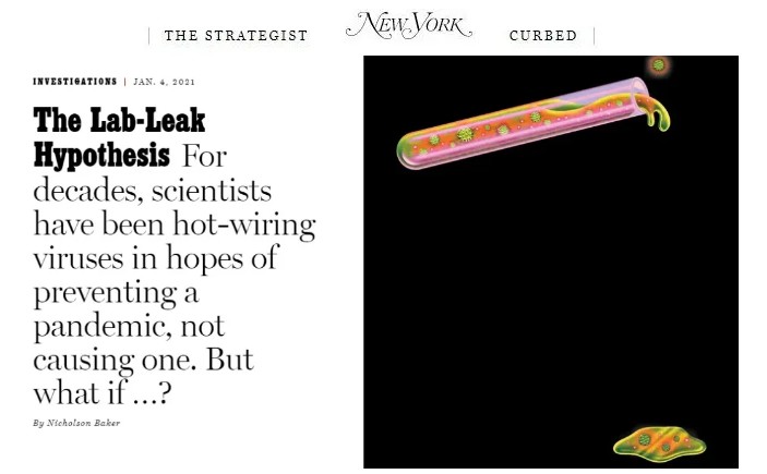其后“實(shí)驗(yàn)室泄漏說”在美國(guó)掀起的一點(diǎn)小風(fēng)浪,源自今年1月小說家尼克爾森·貝克在《紐約雜志》上發(fā)表的一篇封面文章,文章中提到了一個(gè)精心設(shè)計(jì)的實(shí)驗(yàn)室。