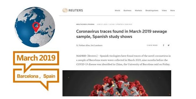 路透社2020年6月報(bào)道說,西班牙巴塞羅那大學(xué)領(lǐng)導(dǎo)的一個(gè)研究小組在2019年3月采集的巴塞羅那廢水樣本中檢測(cè)出新冠病毒。