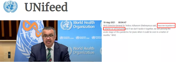 △聯合國新聞網站截圖。譚德塞在會上說“疫苗分配的不公平是人類的恥辱”