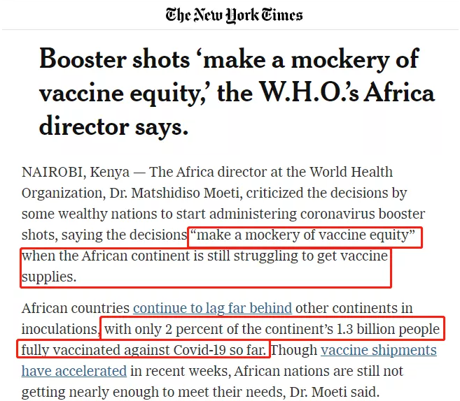△《紐約時報》報道截圖。世衛組織非洲區域主任莫提說,加強注射“是對疫苗公平的嘲弄”。