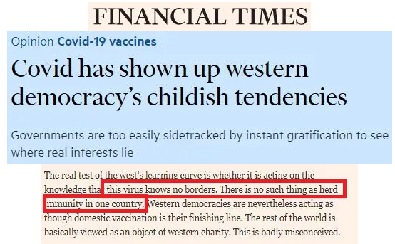 英國《金融時報》在《新冠病毒暴露了西方民主的幼稚傾向》中提到:不存在某一個國家可以獨享的群體免疫。然而,西方國家卻表現得好像國內接種疫苗就是他們的終點線,世界其他地區基本上被視為西方慈善的對象。這是嚴重錯誤的想法。