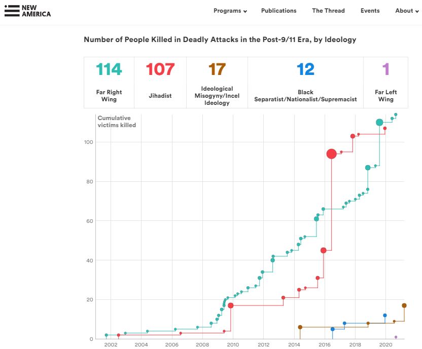 華盛頓智庫“新美國”的報告指出,2002年至2020年,美國共有107人死于所謂“圣戰(zhàn)”分子發(fā)動的襲擊;而美國本土的白人至上主義者、反政府民兵等極右翼恐怖分子的襲擊造成114人死亡,比“圣戰(zhàn)”分子制造的襲擊更致命。