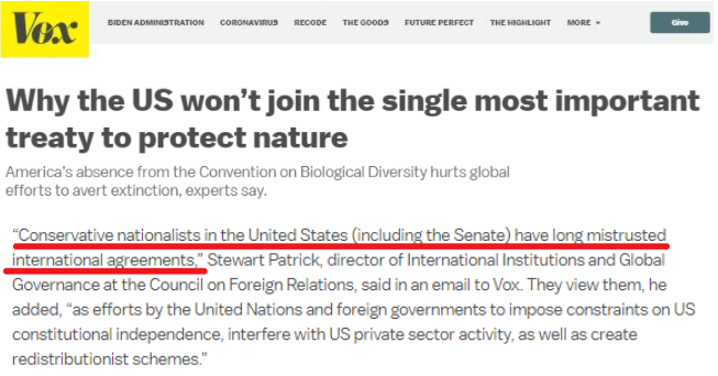 △美國沃克斯新聞網站(VOX)在文章《美國為什么不加入保護自然的最重要條約》中援引專家的觀點指出,美國保守的民族主義者(包括參議院)長期以來一直不信任國際協議,認為它們“是聯合國和外國政府對美國憲法獨立性施加限制、干預美國私營部門活動以及創造再分配主義計劃的努力”。