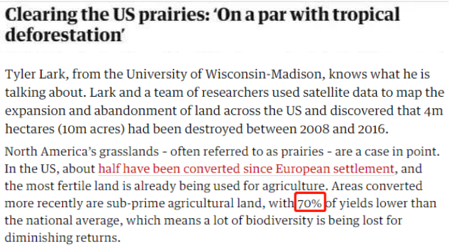 文章援引美國專家的研究成果指出,在2008年至2016年期間,美國有400萬公頃土地被毀。特別是美國對大草原的破壞性開發,“相當于對熱帶森林的亂砍濫伐”。這片曾經在世界上面積最大的草原現在大約一半已被用于農業。而最近開發的農業用地已經降級為次優等級,其農業產量比全國平均水平低70%。