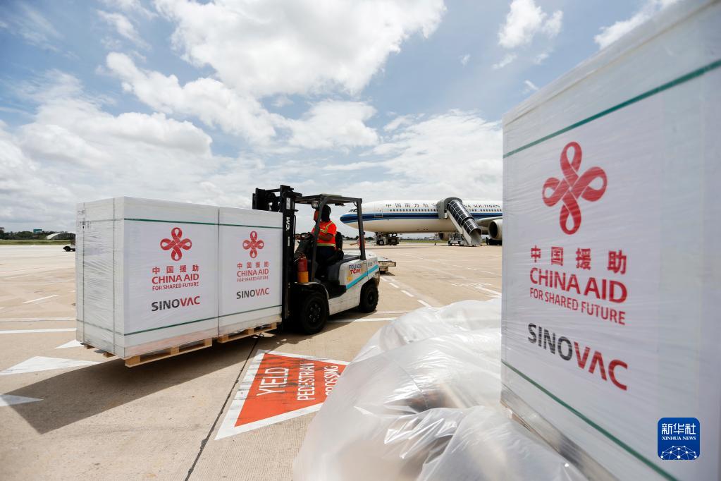 10月14日,工作人員在柬埔寨金邊國際機場運輸中國政府援助柬埔寨的科興新冠疫苗。新華社發(批隆 攝)