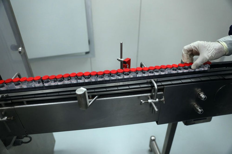 這是2021年9月6日在埃及吉薩的埃及生物制品與疫苗公司疫苗生產(chǎn)廠拍攝的疫苗生產(chǎn)線上的新冠疫苗。2021年4月21日,中國科興公司與VACSERA公司簽署在埃及生產(chǎn)科興新冠疫苗的協(xié)議。