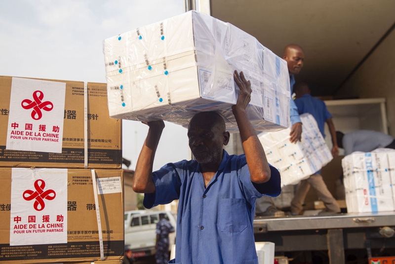2021年10月14日,工作人員在布隆迪經(jīng)濟(jì)首都布瓊布拉卸載中國援助的國藥新冠疫苗。