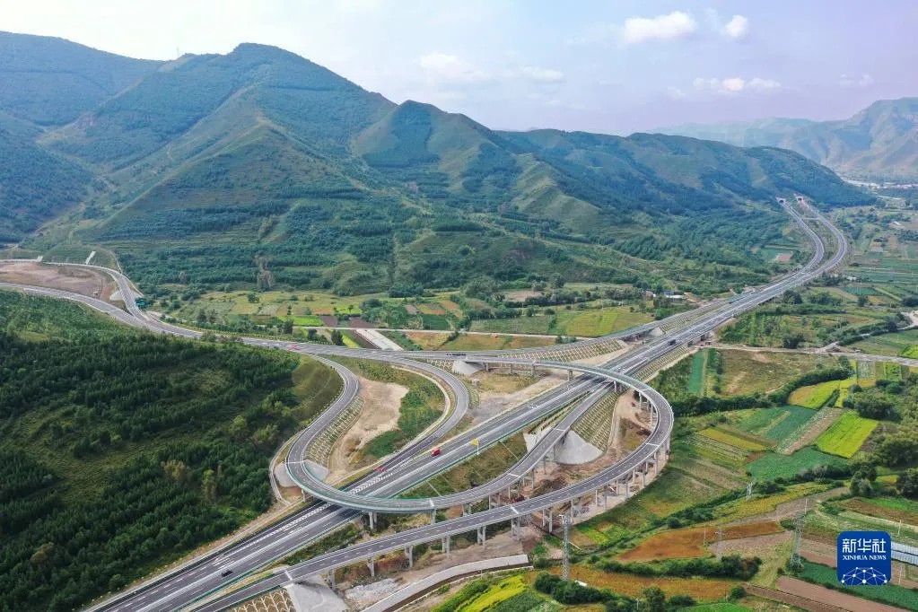 這是2021年8月31日拍攝的延崇高速河北段延伸工程張家口市崇禮白旗互通樞紐(無人機照片)。新華社發(武殿森 攝)