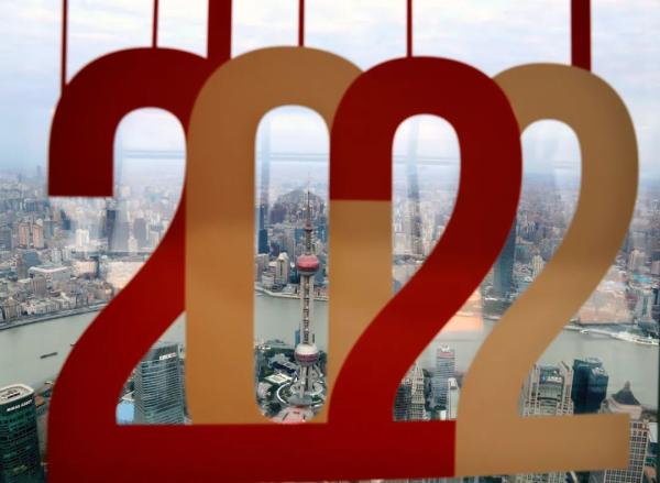 2022年1月1日,上海環球金融中心100層觀光廳的“2022”新年裝飾與陸家嘴的樓群相映襯。新華社記者 劉穎 攝