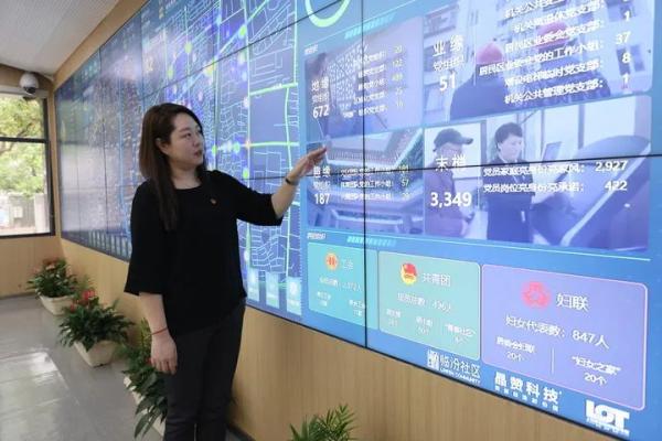 在上海市靜安區臨汾路街道辦事處,工作人員介紹黨建網格的應用場景(2020年9月21日攝)。新華社記者 王翔 攝