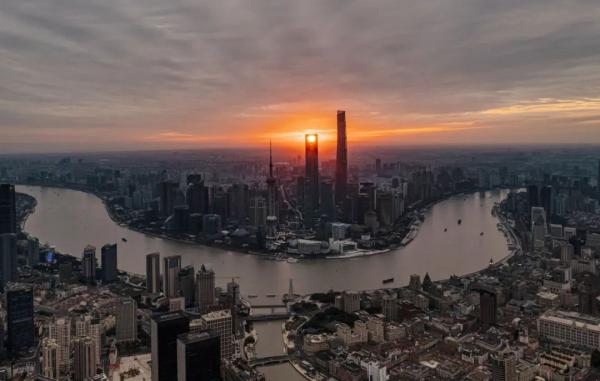 2022年1月1日拍攝的上海陸家嘴新年初升的太陽(無人機照片)。新華社發(楊帆 攝)