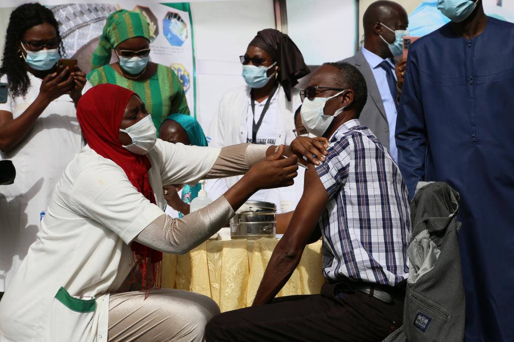 2021年2月23日,塞內(nèi)加爾傳染病學(xué)專家穆薩·賽義迪(前右)在首都達(dá)喀爾接種中國(guó)新冠疫苗。(新華社記者邢建橋攝)