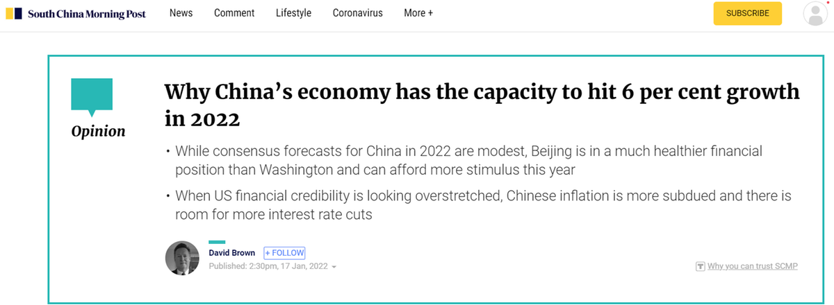 香港《南華早報(bào)》評(píng)論認(rèn)為,中國的金融狀況要比美國健康得多,政策空間很大。中國經(jīng)濟(jì)有能力在 2022 年實(shí)現(xiàn) 6% 的增長。