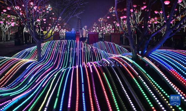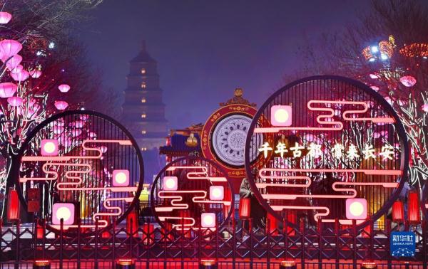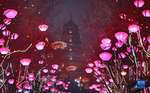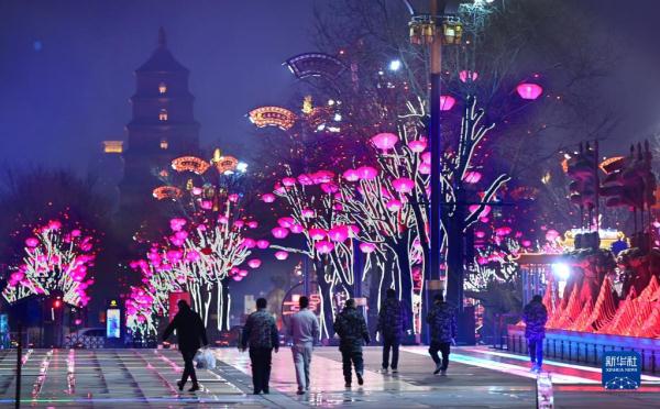 春節臨近,西安市大唐不夜城點亮璀璨奪目的燈光,迎接新春佳節的到來。