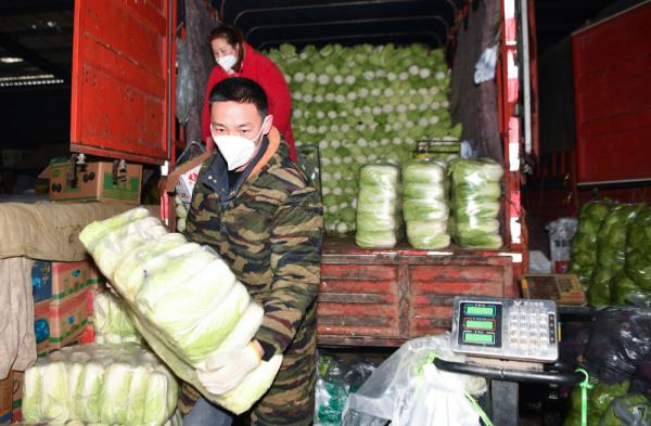 ↑1月24日,在西安市胡家廟蔬菜批發(fā)市場,工作人員搬運即將投放市場的儲備菜。