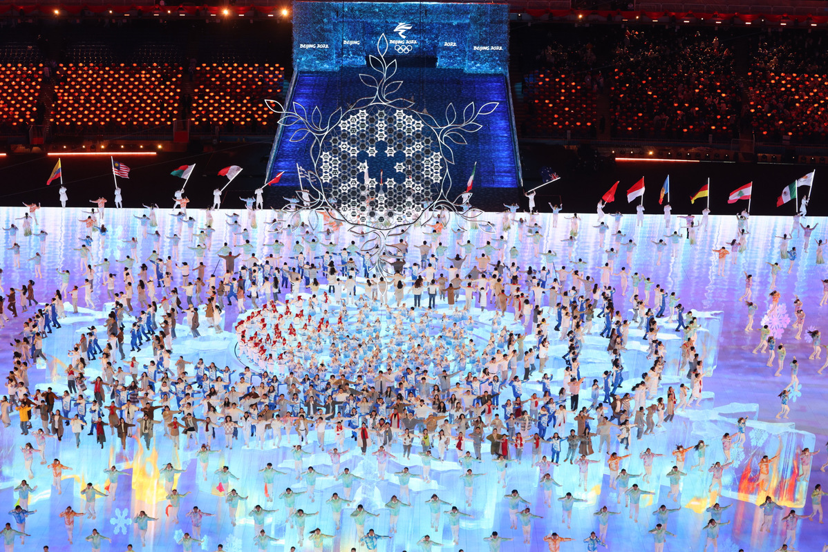 與開幕式一樣,閉幕式亦由張藝謀擔任總導演。晚8點,閉幕式正式開始。音樂響起,一群可愛的孩子出現在舞臺上——他們手持雪花造型的花燈,在“冰面”上盡情嬉鬧、舞蹈。隨著表演進行,孩子們在不同位置用手中的小花燈點亮地屏上的“冬”字會徽。一時間,華燈盛照,暖意融融。