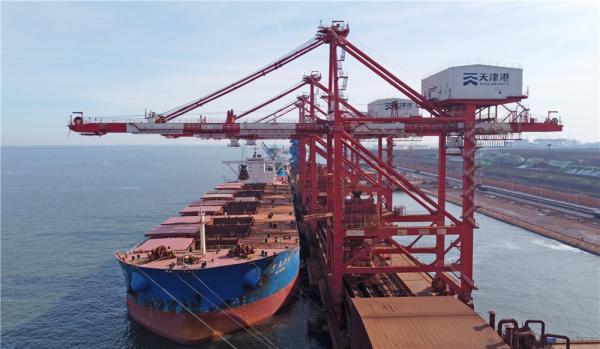 在天津港南疆港區(qū)26泊位,卸船機在進行卸貨作業(yè)(1月28日攝,無人機照片)。新華社記者 趙子碩 攝