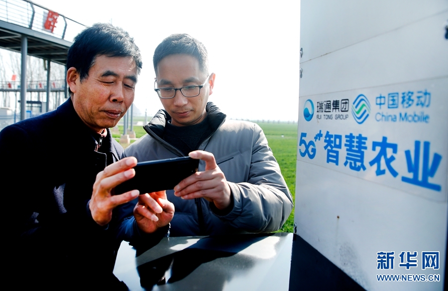 2月27日,河南省開(kāi)封市尉氏縣張市鎮(zhèn)萬(wàn)畝高標(biāo)準(zhǔn)農(nóng)田,技術(shù)人員在利用5G手機(jī)在對(duì)小麥進(jìn)行噴灌管理。