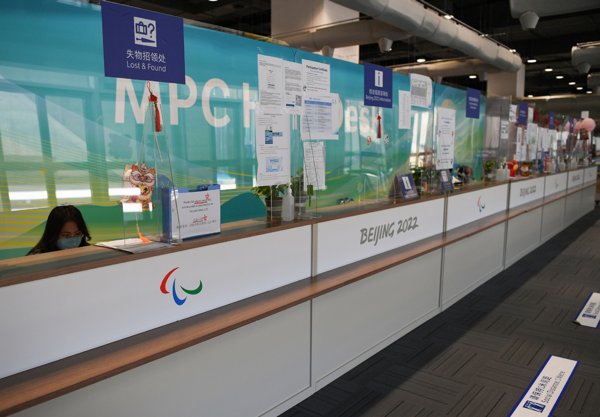 北京賽區(qū)主媒體中心內(nèi)已完成標(biāo)識(shí)轉(zhuǎn)換的媒體工作間服務(wù)臺(tái)。(圖片來源:新華社)