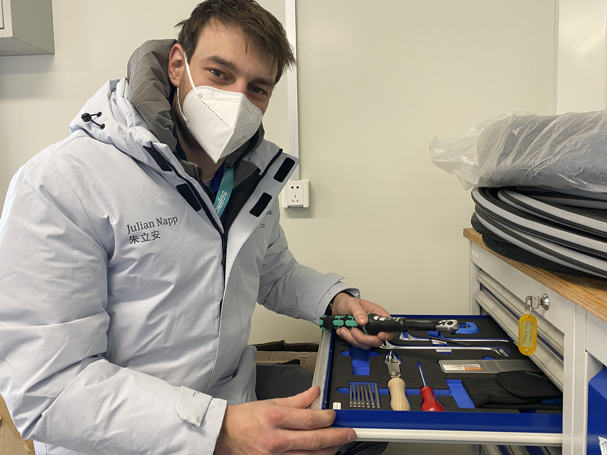 2月25日,在云頂滑雪公園,矯形器、假肢與輪椅維修中心的維修技術(shù)人員朱利安·納普展示工作中需要使用的各類工具。(圖片來源:新華社)