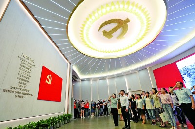 黨員在上海中共一大紀(jì)念館重溫入黨誓詞。新華社發(fā)