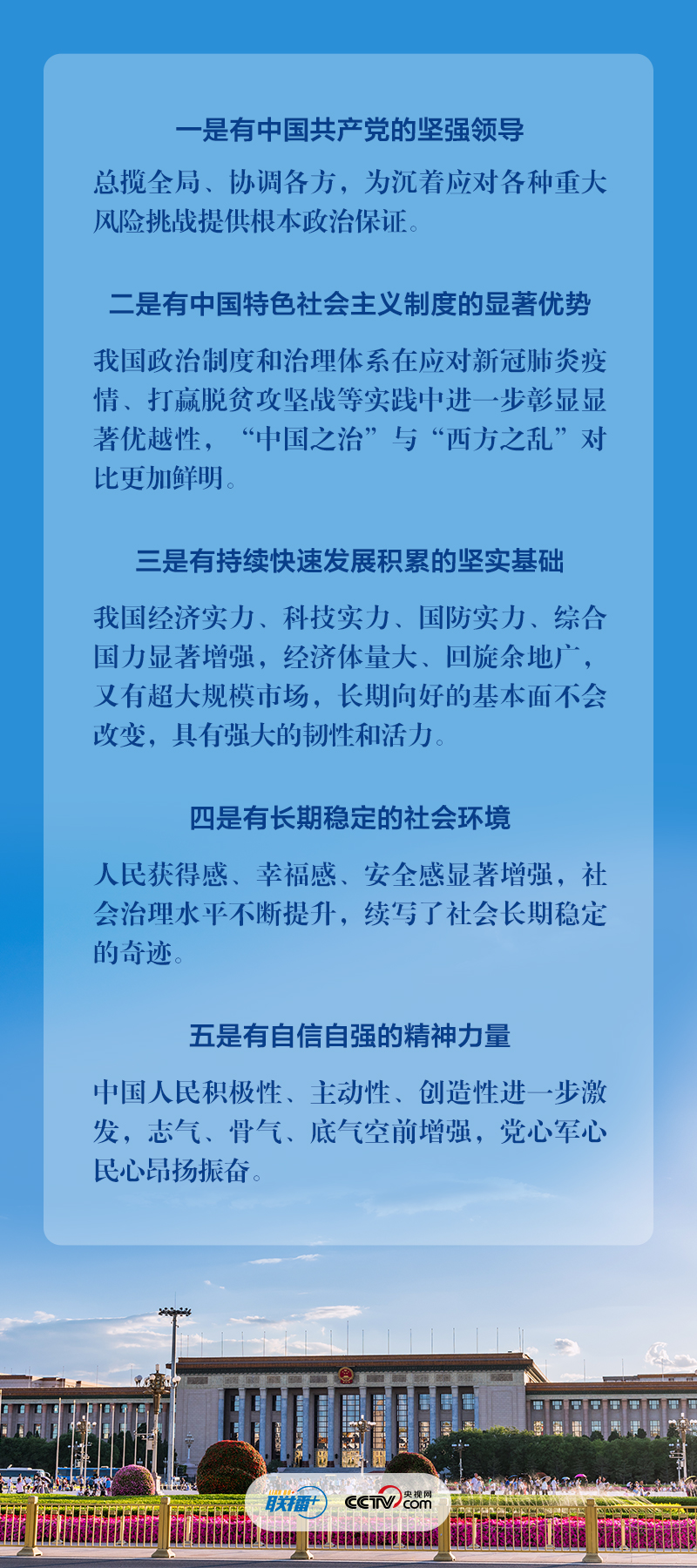 當(dāng)前,國(guó)際形勢(shì)繼續(xù)發(fā)生深刻復(fù)雜變化,百年變局和世紀(jì)疫情相互交織,經(jīng)濟(jì)全球化遭遇逆流,大國(guó)博弈日趨激烈,世界進(jìn)入新的動(dòng)蕩變革期,國(guó)內(nèi)改革發(fā)展穩(wěn)定任務(wù)艱巨繁重。總書記在講話中列舉了我國(guó)發(fā)展中具備的五方面戰(zhàn)略性有利條件: