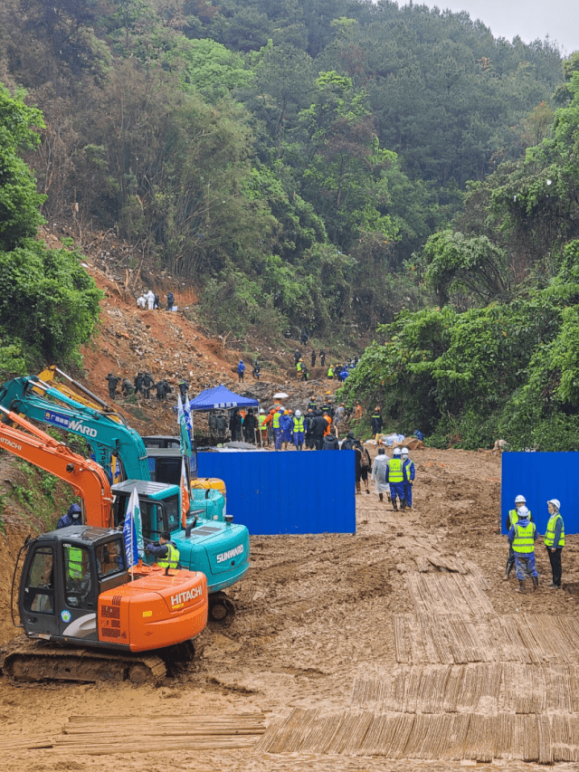 記者在現(xiàn)場(chǎng)看到,持續(xù)降雨導(dǎo)致路面泥土松軟黏稠,一些地方出現(xiàn)積水,人員行走不便,救援人員送來(lái)竹架板鋪在地上,以增大鞋面與地面的摩擦,防止打滑,便于救援工作順利開(kāi)展。在事故現(xiàn)場(chǎng)核心區(qū)域,挖掘機(jī)等設(shè)備已準(zhǔn)備就緒。