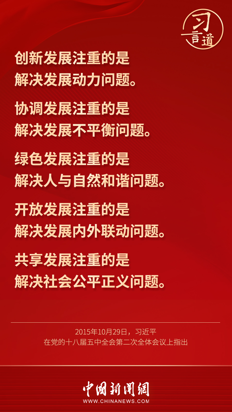 黨的十八大以來,以習(xí)近平同志為核心的黨中央創(chuàng)造性地提出以“創(chuàng)新、協(xié)調(diào)、綠色、開放、共享”為主要內(nèi)容的新發(fā)展理念。習(xí)近平總書記多次在重要會(huì)議和活動(dòng)中闡釋新發(fā)展理念的深刻含義——