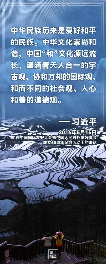 中國走和平發展道路,不是權宜之計,更不是外交辭令,而是從歷史、現實、未來的客觀判斷中得出的結論,是思想自信和實踐自覺的有機統一。進入新時代以來,習近平在多個場合,這樣闡述——