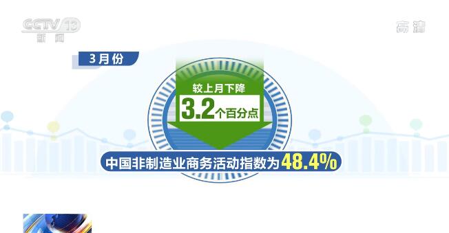 3月份,中國非制造業(yè)商務(wù)活動指數(shù)為48.4%,較上月下降3.2個百分點;新訂單指數(shù)為45.7%,較上月下降1.9個百分點,顯示非制造業(yè)供需增速較上月均明顯放緩。