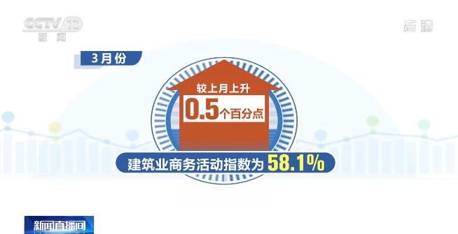 另外,受疫情影響相對較小的行業(yè)活動表現(xiàn)良好,較好發(fā)揮了托底非制造業(yè)增長的作用。其中,3月份,建筑業(yè)商務(wù)活動指數(shù)為58.1%,較上月上升0.5個百分點,連續(xù)2個月環(huán)比上升。