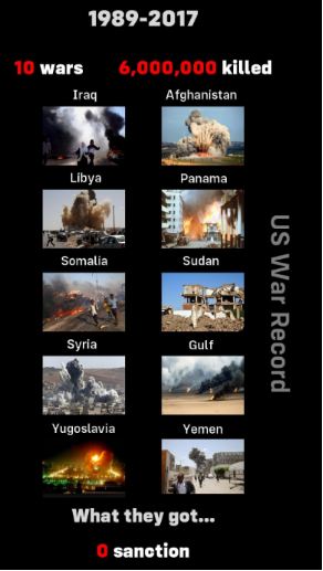 汪文斌發布的這張寫有“美國戰爭記錄”的圖片顯示,1989年到2017年期間,美國發動(參與或挑起)了10場戰爭,導致600萬人被殺害。這些戰爭包括伊拉克戰爭,阿富汗戰爭,利比亞戰爭,巴拿馬戰爭,索馬里戰爭,蘇丹戰爭,敘利亞戰爭,海灣戰爭,南斯拉夫戰爭,也門戰爭。列舉這些殘酷事實后,圖片底部寫道,“他們得到了什么……0制裁”。而這條帖子的配文中,同樣寫有“美國戰爭記錄”“沒有雙重標準”“沒有制裁”,以此發起警示!