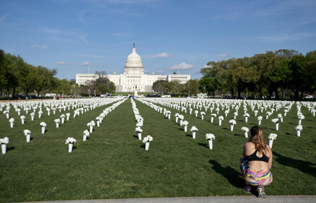 2021年4月13日,一名女子觀看美國華盛頓國家廣場草坪上擺放的白色絹花。新華社記者 劉杰 攝